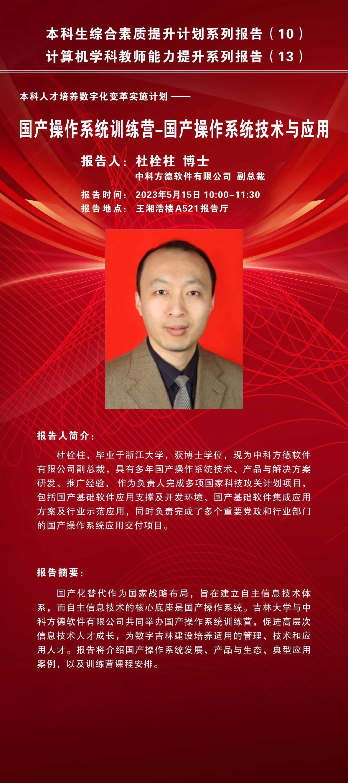 杜栓柱,毕业于浙江大学,获博士学位,现为中科方德软件有限公司副总裁,具有多年国产操作系统技术、产品与解决方案研发、推广经验,作为负责人完成多项国家科技攻关计划项目,包括国产基础软件应用支撑及开发环境、国产基础软件集成应用方案及行业示范应用,同时负责完成了多个重要党政和行业部门的国产操作系统应用交付项目。