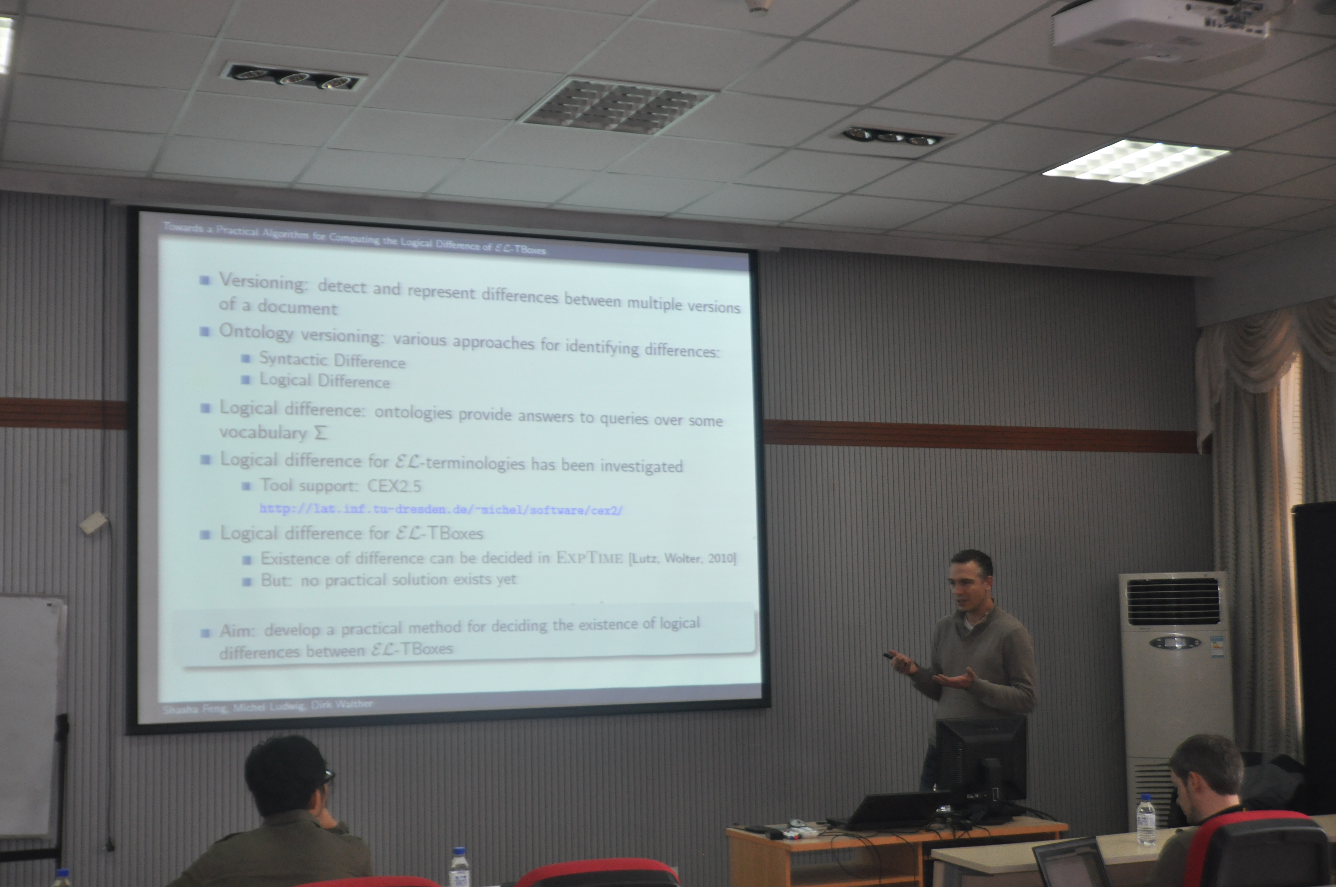 在计算机科学与信息科学中,本体作为一种知识表示方法为特定领域中的概念及其相关之间关系提供形式化表达。本体的构建与维护需要本体的版本控制来管理同一本体的不同版本。2008年提出的本体间的逻辑差概念能更准确地体现本体不同版本间的语义差别。EL术语集之间的逻辑差求解问题已经解决,但是,表达能力更强的EL TBox之间的逻辑差求解算法仍然未知。Walther博士在讲座中讲解了其最新的研究成果,并且很愿意在接下来的两周时间里与相关师生继续探讨。来自数学公司和计算机公司的师生听取了讲座。