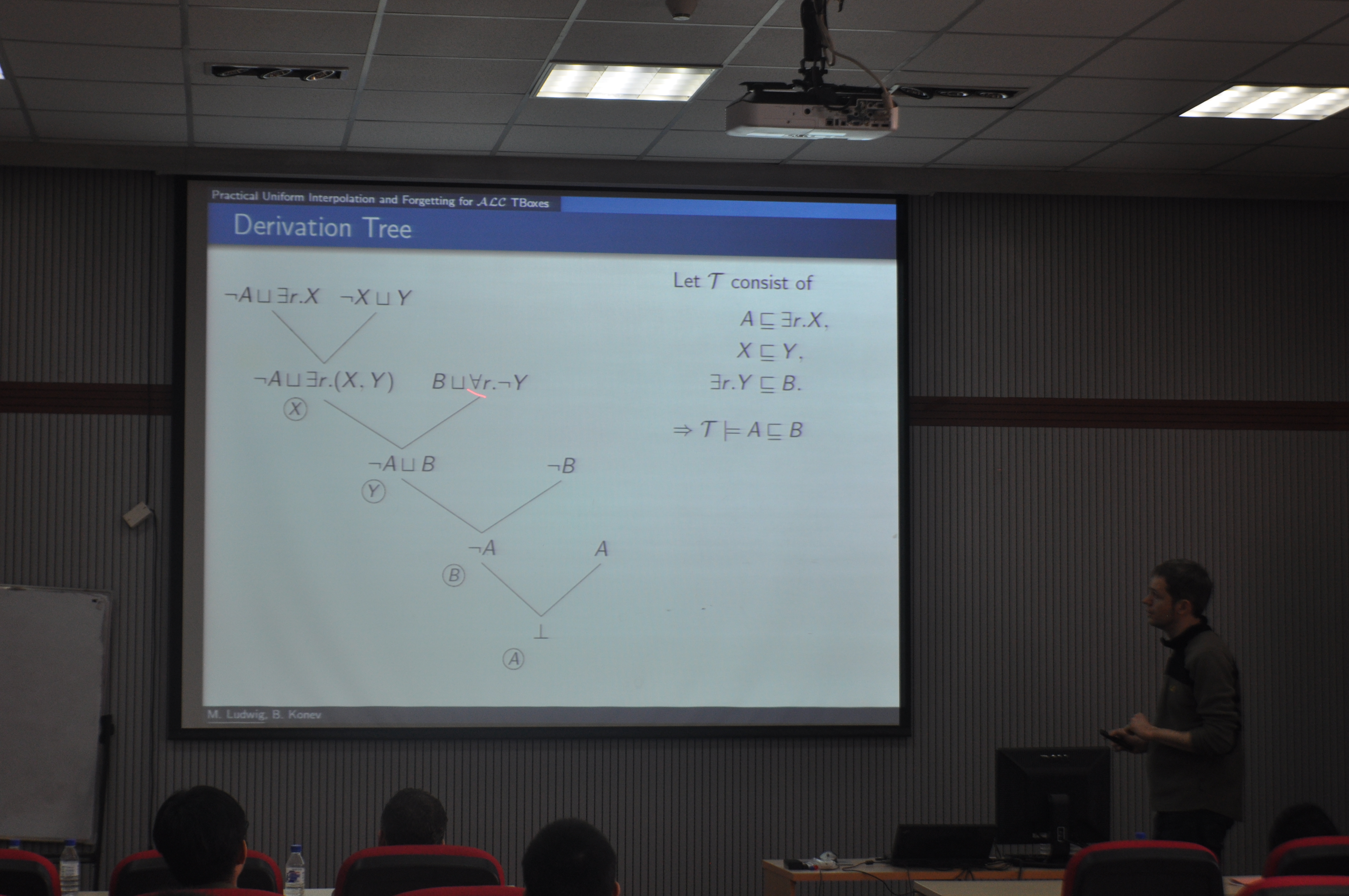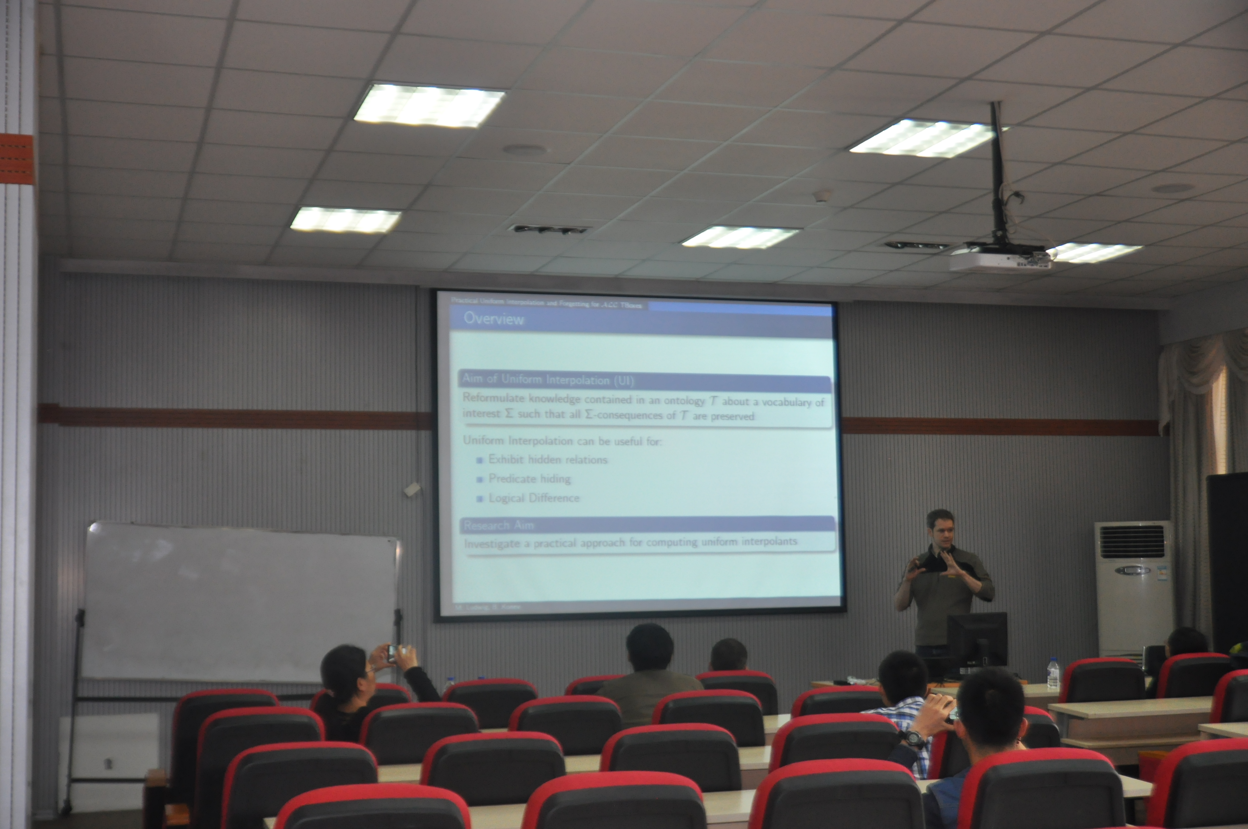 近日,德国德累斯顿工业大学Michel Ludwig博士在伟德国际国际处的青年骨干教师引智培育计划项目资助下来公司进行为期两周的学术交流活动。2015年11月4日上午,Michel Ludwig博士做题为“实用的 ALC TBoxes的规范插值与遗忘算法及其在逻辑差中的应用”的学术报告。