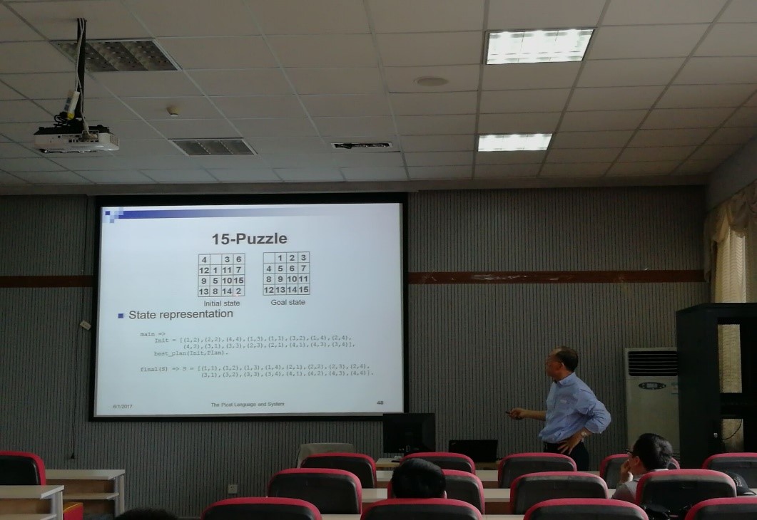 本次讲座Neng-Fa Zhou教授介绍了Picat,是一种基于逻辑的多范式编程的新型语言,将逻辑编程,函数式编程,动态规划与表,脚本相结合。Picat由于自身特点,在符号计算方面比F#和Python等更有优势。接下来展示了MiniZinc竞赛的一些实验效果,介绍了Paicat下的组合搜索,如动态规划、15-Puzzle等,其求解优势很明显。之后介绍了一些参考文献,分享了名为“Constraint Solving and Planning with Picat”的书。