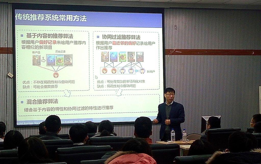 陈恩红教授的报告以教育大数据挖掘为主题,分为教育大数据介绍、推荐系统、教育推荐系统三部分。陈老师首先介绍了大数据背景下教育领域大数据的研究现状以及未来的研究前景展望。然后,陈老师介绍了推荐系统的基本概念以及常见的推荐算法,包括协同过滤、内容过滤等。最后,陈老师介绍了教育推荐系统的核心理念以及相关推荐算法的设计思想,同时也介绍了他所带领的研究团队近些年在教育大数据推荐领域所取得的一些学术成果与开发的一些应用软件。