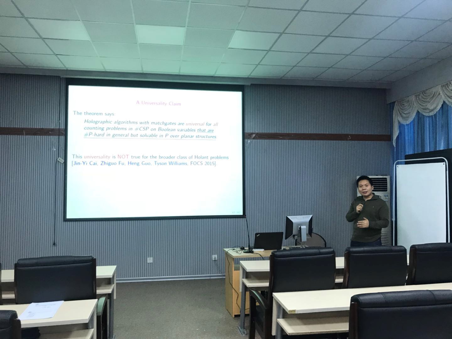 2017年12月13日上午,付治国博士在伟德国际计算机公司做了题为“Holographic Algorithm with Matchgates Is Universal for Planar #CSP Over Boolean Domain”的学术报告。付治国博士于2009年在伟德国际获计算数学博士学位,现为东北师范大学信息科学与技术公司副教授,2014年-2017年在美国威斯康星大学麦迪逊分校从事计算复杂性研究。主要研究方向为计数问题的计算复杂性、包括计数问题的计算复杂性分类、全息算法以及计数问题的近似算法和随机算法,已在STOC, FOCS, SIAM. J. Computing, J. Information and Computation等著名会议和期刊发表多篇论文。