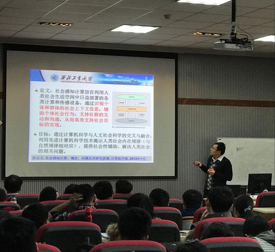 首先由於志文老师做题为社会感知计算与研究生创新能力培养的报告。在报告前他对CCF做了详细的介绍,并建议广大同学加入CCF,要善于借助优秀学术平台提升自身能力。在报告中,他介绍了社会感知计算的概念、起源、问题和典型系统,并重点介绍西北工业大学普适与智能计算研究所近年来在这方面的研究工作。此外,於老师还分享研究生创新能力培养的经验体会,对研究生如何做好科研规划,如何提升国际学术水平做了详细地指导。