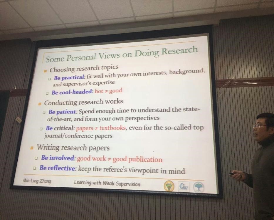 随后,由张敏灵老师带来题为弱监督机器学习的报告。他首先详细地介绍了近年来弱监督机器学习在国际机器学习领域的进展,并简要介绍了不同类型的弱监督机器学习框架。然后他还介绍了自己的团队在相关领域的研究进展。最后,张老师在如何选择研究课题、如何做具体研究工作以及如何撰写学术论文等多个方面给和参会师生分享了自己的体会,引发了大家的思考。