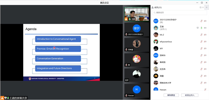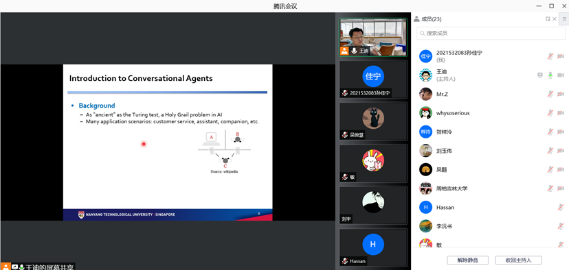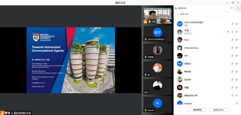 2021年12月4日下午,新加坡南洋理工大学王迪博士应伟德国际始于英国1946邀请,通过腾讯会议线上作了题为“人性化的智能会话代理”的学术报告。