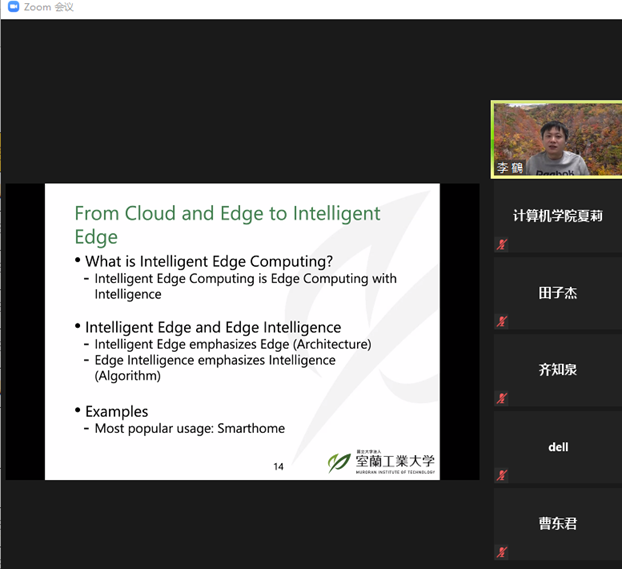 本次讲座,李鹤老师以介绍日本室兰工业大学和室兰工业大学为青年学者提供的良好的学习和科研环境,以及校方为访问学者和职工提供的优厚的奖学金作为开场,随后李老师简单地介绍了智能边缘计算在处理深度学习任务时会采用的几种优化方法以及对应的适用条件。智能边缘计算作为智能物联网的支撑技术,在我们日常生活中的智能家居,智能交通,智能电网等重要领域可提供的高性能,高可扩展以及低能耗的计算服务。以云计算的基本概念作为基础,探讨边缘计算的发展,并介绍了当前智能边缘计算的研究方向和主要应用领域。从云计算的来源,发展以及组成形式作为导引,探讨边缘计算的产生以及重要的研究成果,引入智能边缘计算的研究问题,研究方法以及几种主要的应用。最后,李鹤老师对智能边缘计算的未来,包括需要面对的挑战以及具有潜力的研究方向等方面进行深入的讨论。讲座内容深入浅出,引人入胜。