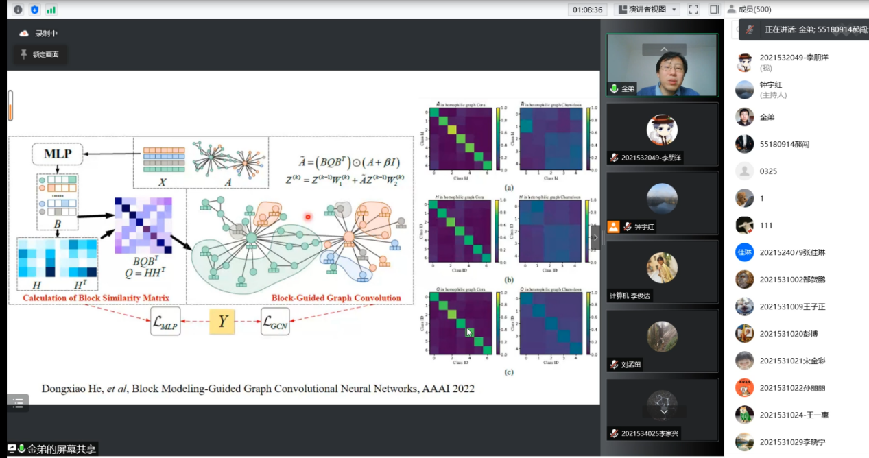 计算机公司副经理王喆教授主持了提问环节,同学们积极提问,金弟老师一一悉心回答,给出自己的理解与建议,同学们不仅了解到了学术前沿动态,对图神经网络的认识有了进一步提高,同时也学习到了论文写作必备的知识。本次活动受到了两院师生的热烈响应。没有一个冬天不能逾越、没有一个春天不会到来,祝愿疫情早日结束,师生平安健康!