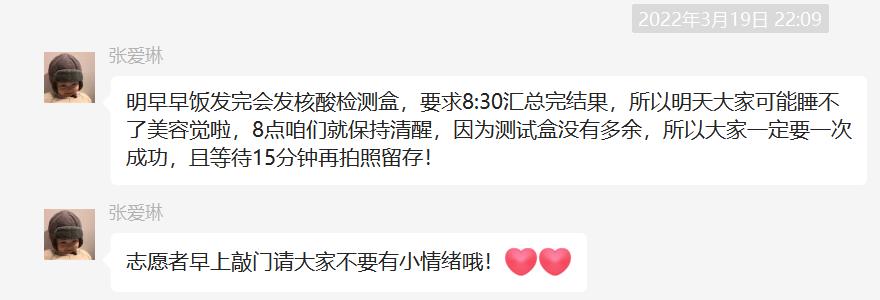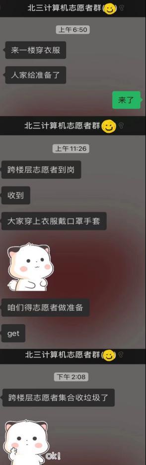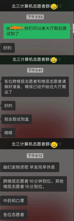 同一时刻,线上的志愿工作也在有条不紊地开展。为实时了解同学们状况、第一时间提供帮助,志愿者们建立了北三计算机通知群,每天在群里认真核对员工用餐人数,传达公司和公司的通知,统计同学们的核酸情况,倾听同学们的意见和需求,安抚同学们封寝时间焦躁的心情。在有些生活用品及药品紧缺的情况下,志愿者们第一时间组织群里的同学们互相帮助,群策群力;面对同学们的一些小情绪和小烦恼,志愿者们也积极调解。前段时间按照集团的防疫要求,大家每天早上都需要按时提交抗原自测结果,同学们不免需要在睡眼惺忪的时候起床检测。每每这时候,志愿者负责人张爱琳总是和平常一样,细心温柔地叮嘱大家,瞬间安抚了同学们的情绪。