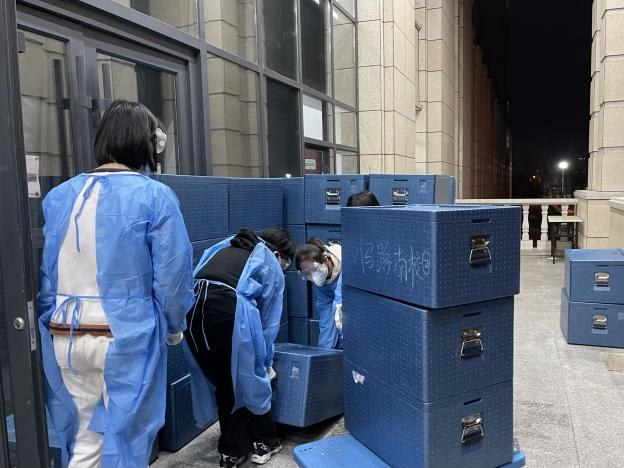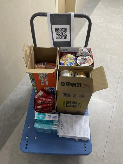 作为北三计算机公司研究生最艰难的是,大家寝室集中在一楼东面,从西门送入的物资无法直接送达,需要先上二楼东面再下一楼,在封寝管控的初期,志愿者们没有小推车,只能人工搬运沉重的饮用水和盒饭,这给本就身体纤弱的女生志愿者们的配送工作带来了不小的困扰。虽然在最开始有些手忙脚乱,但是志愿者们在防疫物资缺乏的情况下不怕辛苦,不畏艰难,往返数次搬运物资,用强大的战疫决心保障了配送工作顺利的进展。