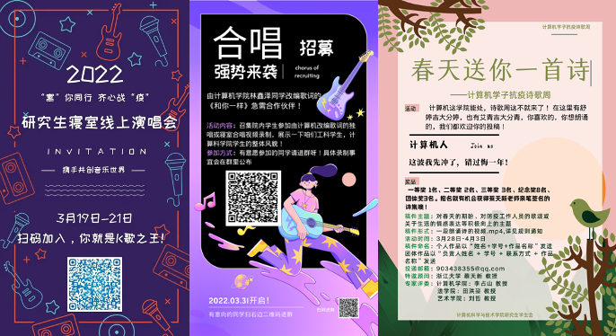 在隔离的闲暇时光中,为丰富同学们的寝室生活,促进室友之间的协作交流,计算机公司与多个公司联合开展了“‘寓’你同行 齐心战‘疫’”研究生线上演唱会。公司学子积极报名参与活动,同学们大展身手,展示多彩多样的曲目,既有爵士乐、也有古典音乐,还有合唱,用音符来抗击疫情,展现了大家乐观向上的精神风貌。