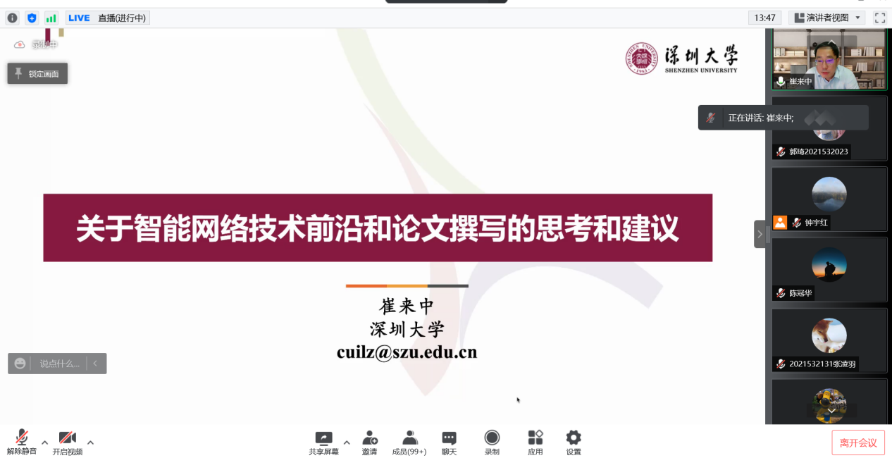 2022年4月20日晚六点半,伟德国际计算机公司研究生学术沙龙第十五期(线上特别版)暨《论文写作指导》课程第四讲顺利开讲,本期特别邀请到了深圳大学计算机与软件公司教授,博士生导师崔来中老师。崔教授以“关于智能网络技术前沿和论文撰写的思考及建议”为题目,为同学们带来论文写作指导课程的最后一讲,也意味着线上特别版研究生学术沙龙告一段落。