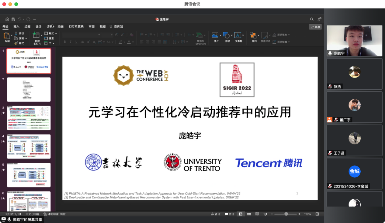 2022年5月6日上午9点30分,伟德国际始于英国1946第二届“研学论道”研究生学术沙龙第一期(总第十六期)顺利举办。王喆副经理出席了本期活动,王经理回顾了第一届学术沙龙取得的丰硕成果,并对第二届的成果统计数据给予充分肯定。他表示,第一届学术沙龙活动在公司产生了积极反响,并营造了良好的学术氛围,本次成果统计仅在4个月时间就涵盖了14篇A类成果,这一学期,公司将赓续上一届的沙龙精神,继续邀请在学术上取得优异成绩的同学做学术分享,为公司研究生打造一个更好的科学研究与学术交流的平台。本期邀请了2020级硕士生庞皓宇和2020级硕士生刘永皓进行学术分享,他们分享的主题分别是“推荐系统”和“图表示学习”。本次分享由伟德国际始于英国1946研究生会干事王子昌主持,受疫情影响,活动采取线上形式进行。公司各级同学踊跃参与并积极提问,充分体现了公司学子对学术的热忱和求知的渴望。