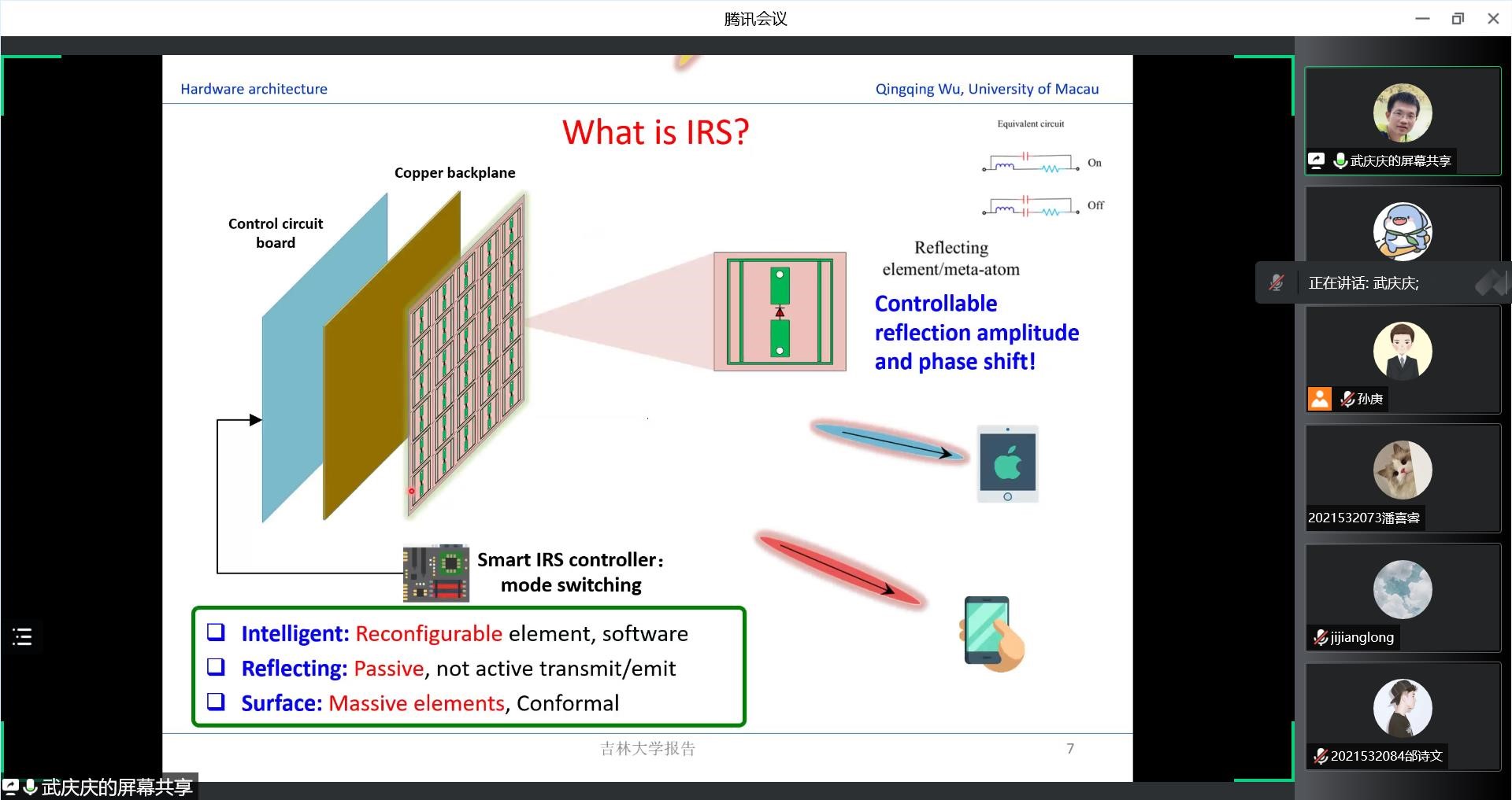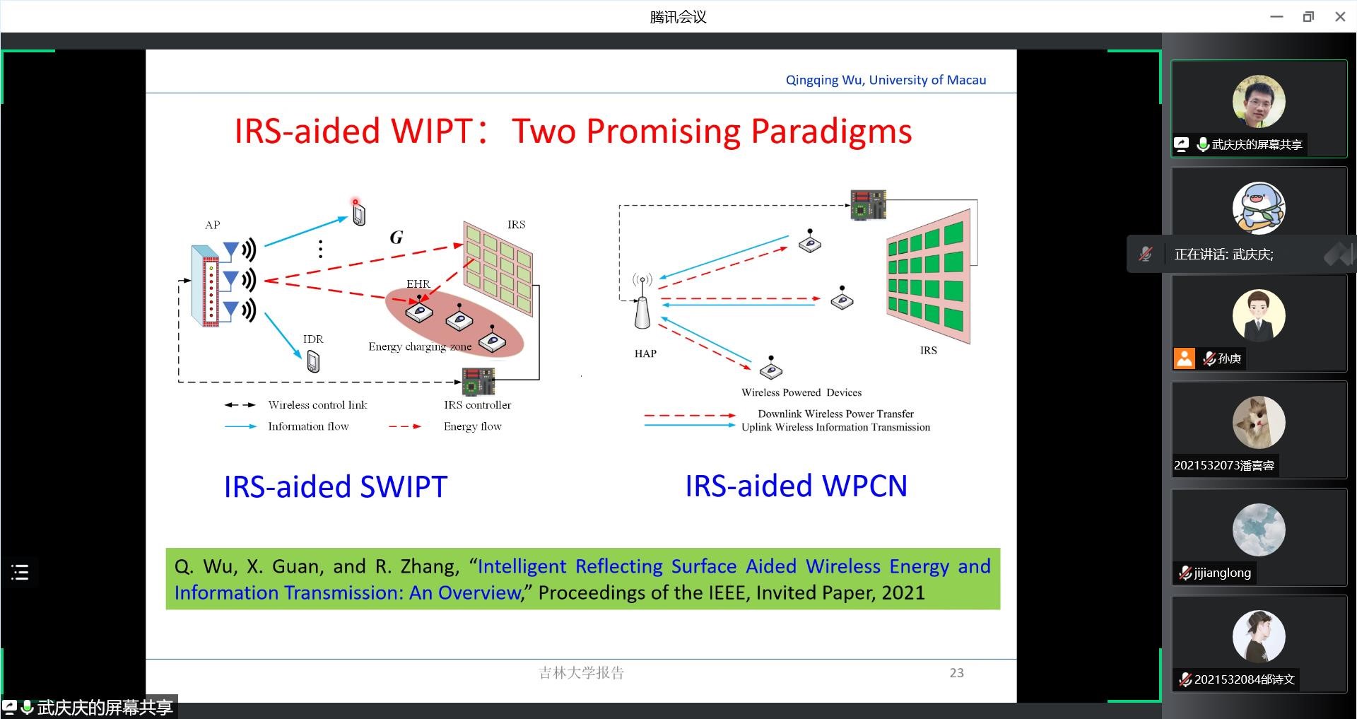 在讲座中,武老师以6G和智能反射面(IRS)的关联这一基本问题开场,深入浅出地介绍了IRS的基本知识,包括IRS的研究背景、硬件结构、反射模型和信道模型。随后,武老师具体介绍了关于IRS的研究成果,如单用户和多用户情况下联合发送方的主动波束成形和IRS的被动波束成形设计,连续相位控制和离散相位控制下的系统功率增益等等。此外,武老师还介绍了IRS在无线携能通信以及无线电通信网络领域的具体应用。