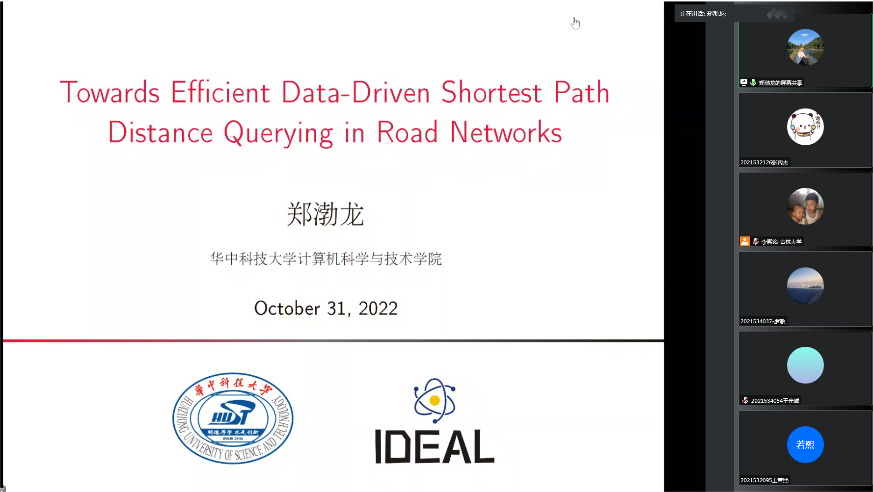 2022年10月31日,华中科技大学郑渤龙老师应伟德国际始于英国1946邀请,利用腾讯会议作了题为“Towards Efficient Data-Driven Shortest Path Distance Querying in Road Networks”的学术报告。伟德国际始于英国1946李熙铭副教授主持了讲座。