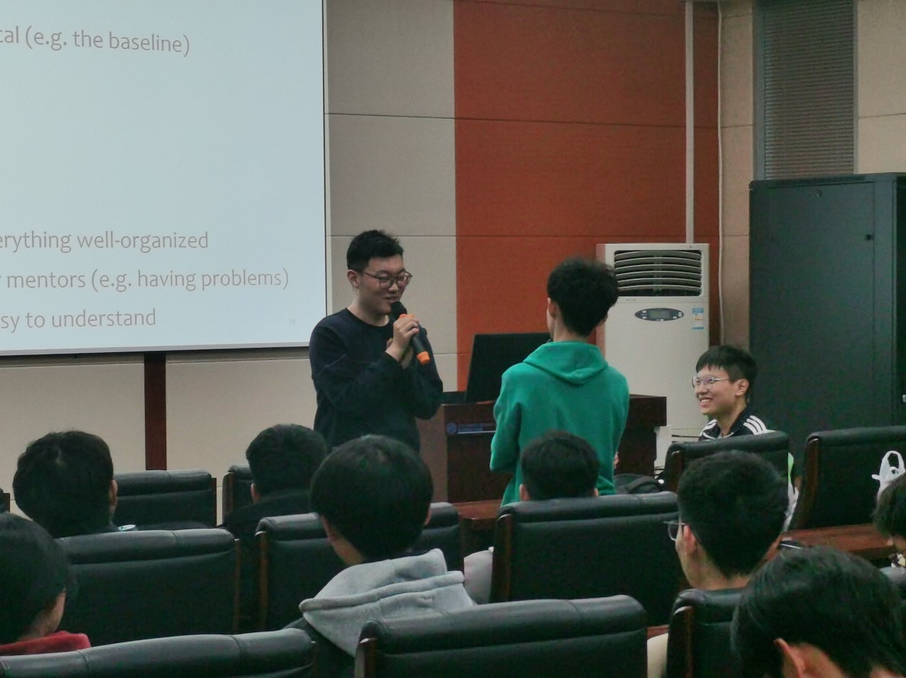 最后,两位学长为大家带来了答疑环节,台下同学积极提出了自己的问题:不知道科研如何入手,怎么办?科研过程中,遇到读不懂的数学公式,怎么办?面对这些实际的问题,学长一一悉心地进行了回答和建议,解开了同学的心头之惑。这样的一问一答不仅吹散了提问者的心头乌云,更是给在场所有同学带来了启发,激励着更多同学投入到本科生科研当中。随着在场同学的问题得到一一解答,本次分享会也接近了尾声,会议结束后,同学们有序退场。
