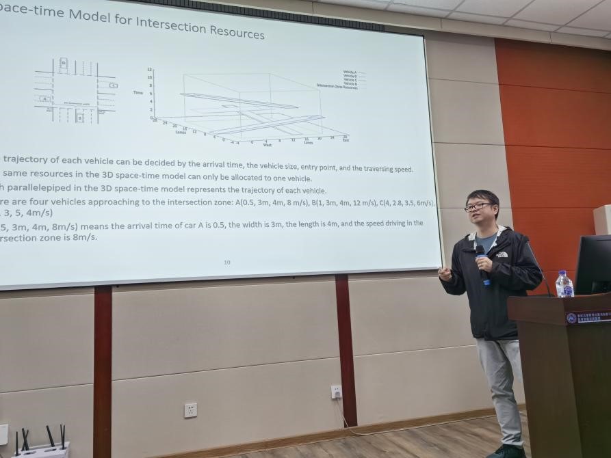 报告主要针对无信号灯交叉路口管理系统(IMS)可以接收来自一个或多个联网驾驶车辆(CAVs)的一个或多个穿越请求,而IMS如何在交叉路口的空间-时间资源模型中确定每个穿越请求的解决方案空间,为每个穿越请求在空间-时间资源模型中找到一个CAV轨迹分配。王楠楠博士在报告中讲到,IMS可以向每辆CAV发送一个已批准的预约,此预约对应于已找到的一个CAV轨迹分配。当一个与CAV相对应的已批准预约已从IMS接收到时,每个CAV都可以按照批准的预约中指定的方式通过交叉路口区域。