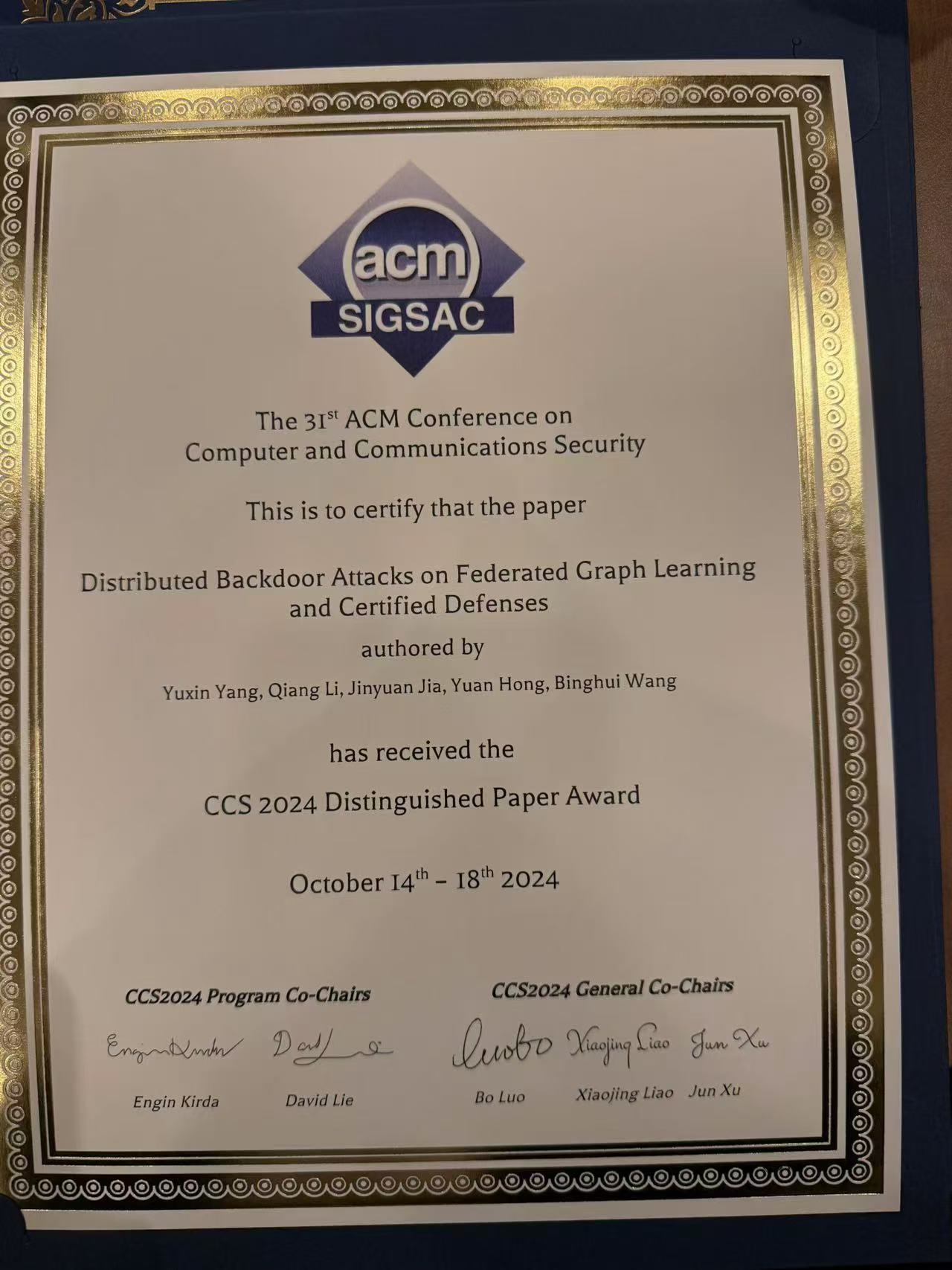 伟德国际始于英国19462022级博士生杨雨欣获得ACM CCS 2024(ACM Conference on Computer and Communications Security)最佳论文奖。ACM CCS是国际上网络与信息安全的四大顶会之一,是CCF推荐A类会议。