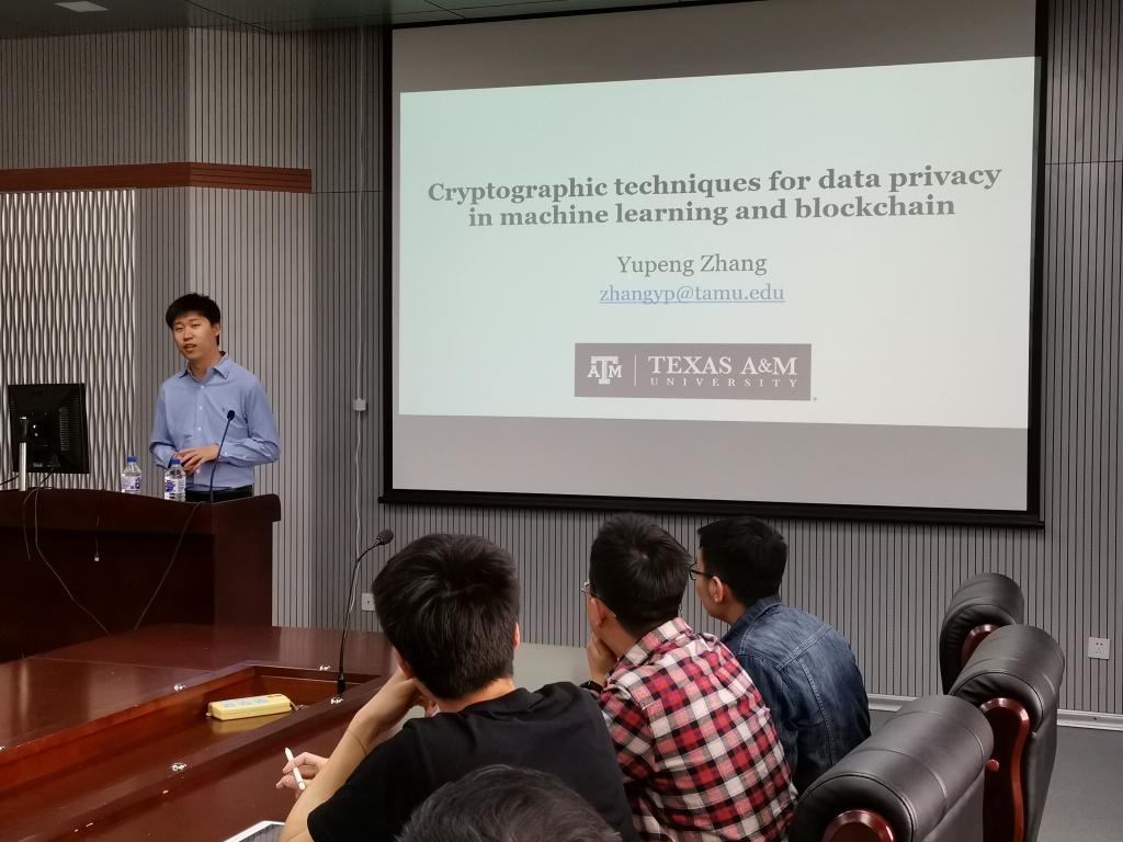 2019年5月10日上午,美国德州农工大学(TAMU塔木)助理教授张宇鹏博士应伟德国际始于英国1946邀请,在计算机楼A515作了题为“机器学习和区块链中数据隐私的加密技术”的学术报告。
