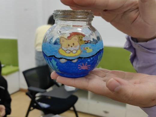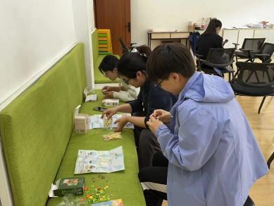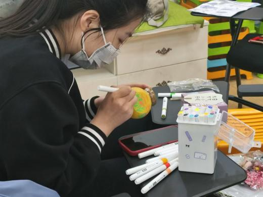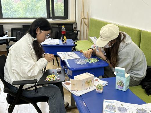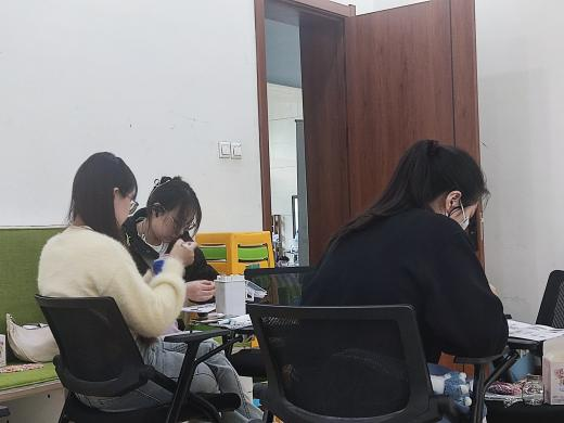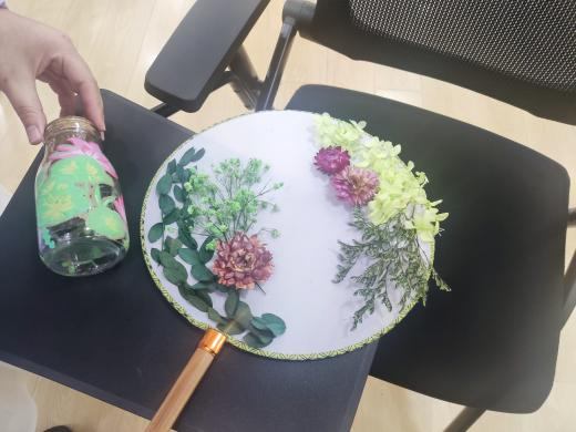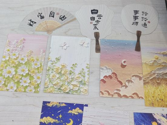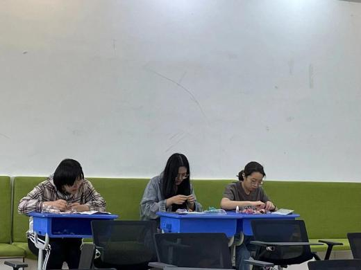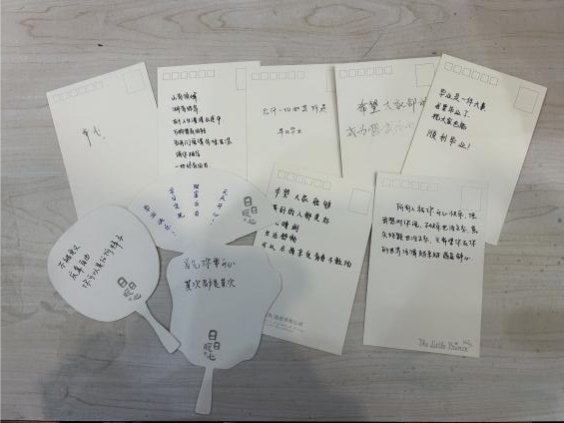 在各单位主办方的联络下,参与与未参与线上环节的各公司同学们相聚敬信教学楼团体辅导室。明信片被写满充满陌生人善意的祝福语,一张张地缓慢地落在收纳盒里;积木花、团扇等手工品在相知相识的过程中被完成,一件件都见证烦恼的倾诉、友谊的建立。