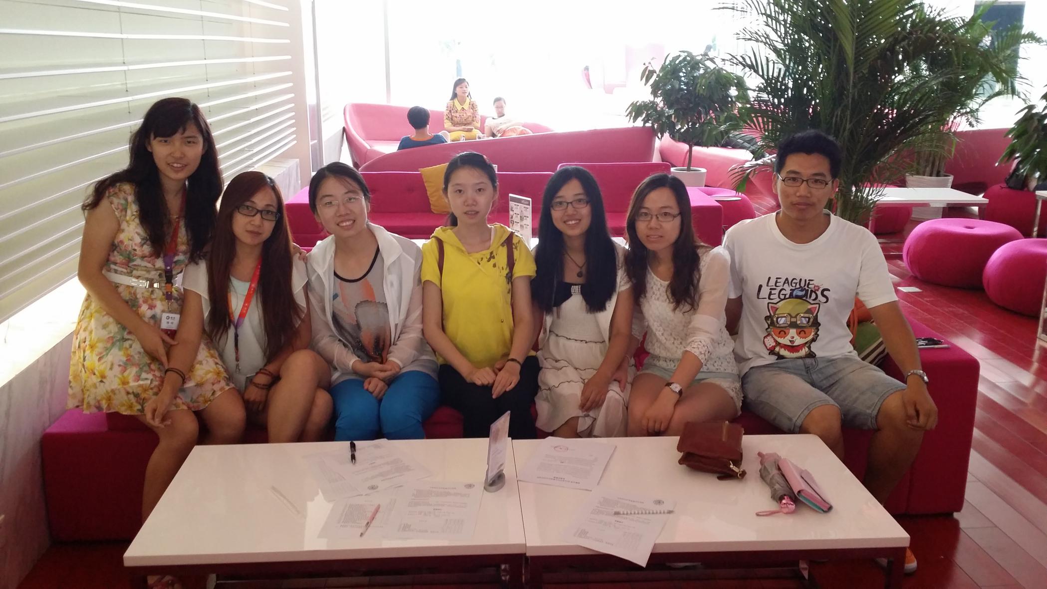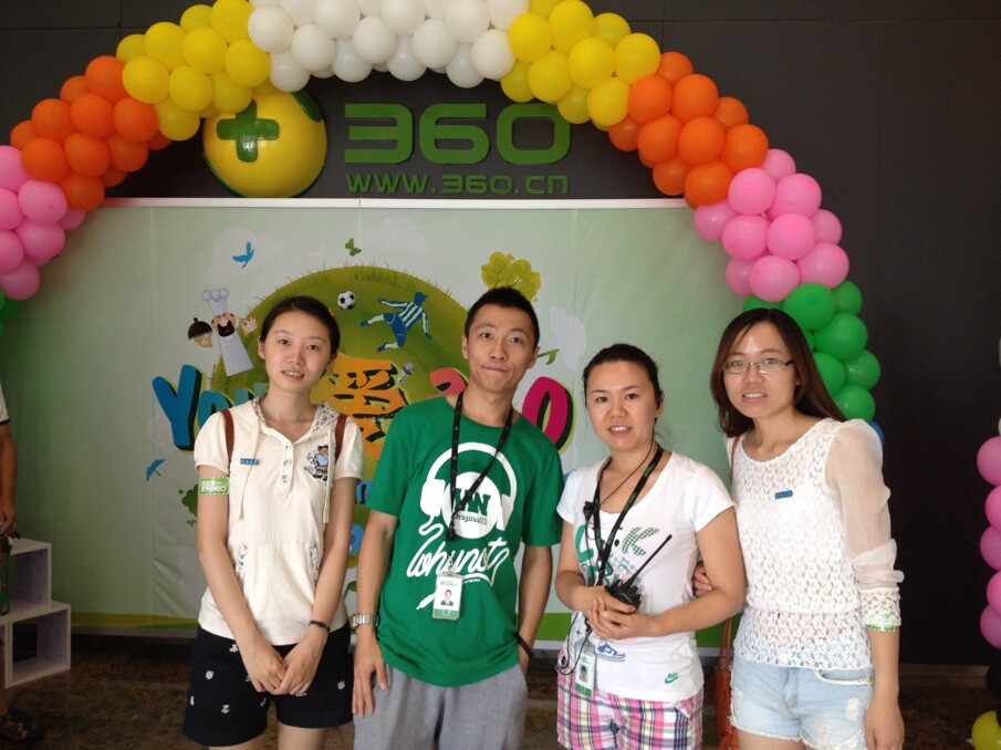 7月20日,在员工的鼎力支持下,在奇虎360公司开展了我们的调查。适逢周末,我们还是看到了少数员工在上班,他们中并不都是在加班,有个别员工是到公司自主学习。在360公司工作的同学带我们参观了公司,并介绍了公司的各个部门的情况,我们在多个部门开展了问卷调查。参观到食堂时,看到许多员工带着自己的家属参加开放日活动,可见,互联网公司对从业者的生活也很关注。