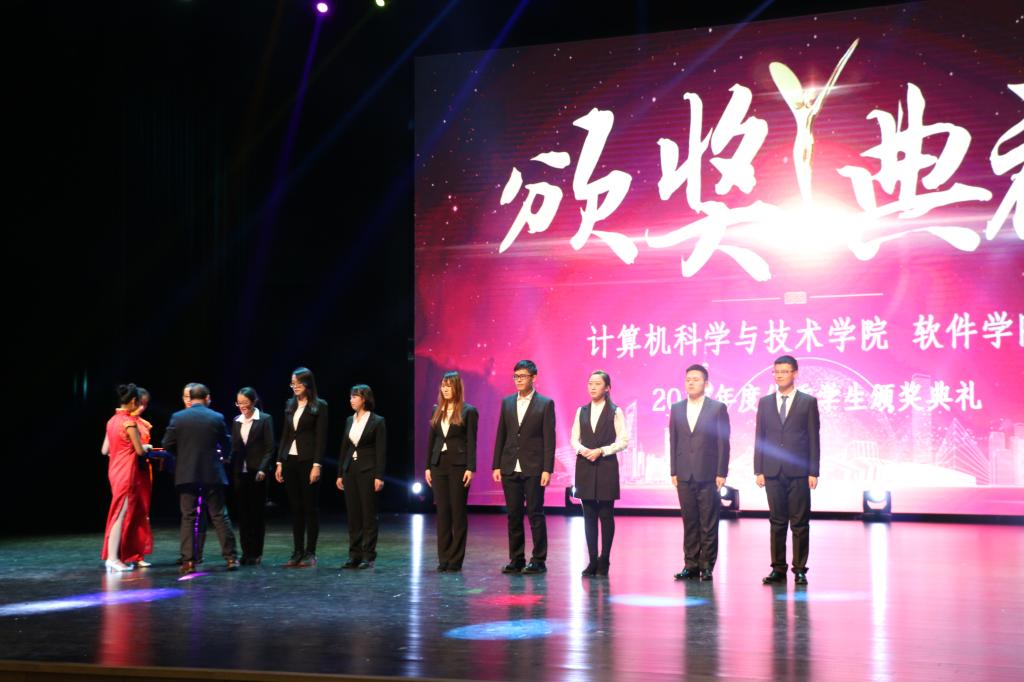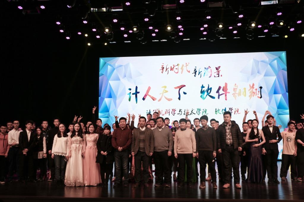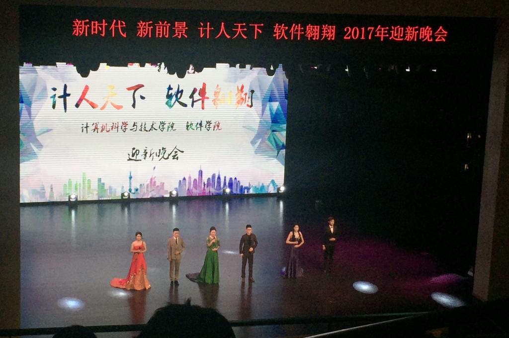 晚上18:30,迎新晚会准时开始,在主持人的引导下,所有观众起身奏唱国歌,计算机公司党委书记孟繁二老师宣读两院“2017年度优秀员工”获奖名单并颁奖合影,之后还有优秀员工代表为新生讲述老员工活的多姿多彩,最后是计算机公司、软件公司经理,博士生导师魏晓辉教授致辞,颁奖典礼到此告一段落。
